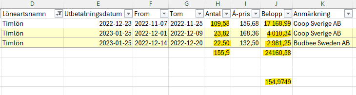 Filtrerar fram timlön och retro timlön. Tag den senaste löneuppdateringsperioden,