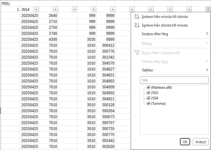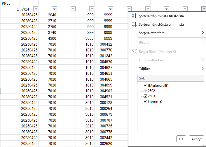 5. Öppna excelfilen, lägg ett filter på översta raden och filtrera på projekt. Se till att alla projekt är föregående månad, justera annars i filen.