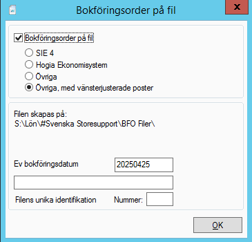 2. Ta ut rapporterna i definitivt läge (preliminärt är inte möjligt när körningen är stängd). Bocka i bokföringsorder på fil, perioden ska vara eftersläpande (månaden innan utbetalningsdagen)
