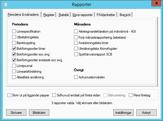 2. Ta ut rapporterna i preliminärt läge. Bocka i bokföringsorder på fil, perioden ska vara eftersläpande (månaden innan utbetalningsdagen)