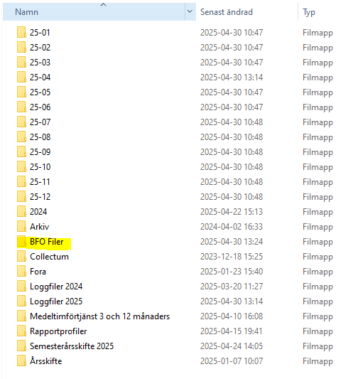 3. När kontrollen är klar, spara excelen i månadens manuella underlag. Låt mallen ligga kvar i BFO filer. VIKTIGT redigera endast i originalfilen, inga justeringar förutom filtrering kan göras i mallen.