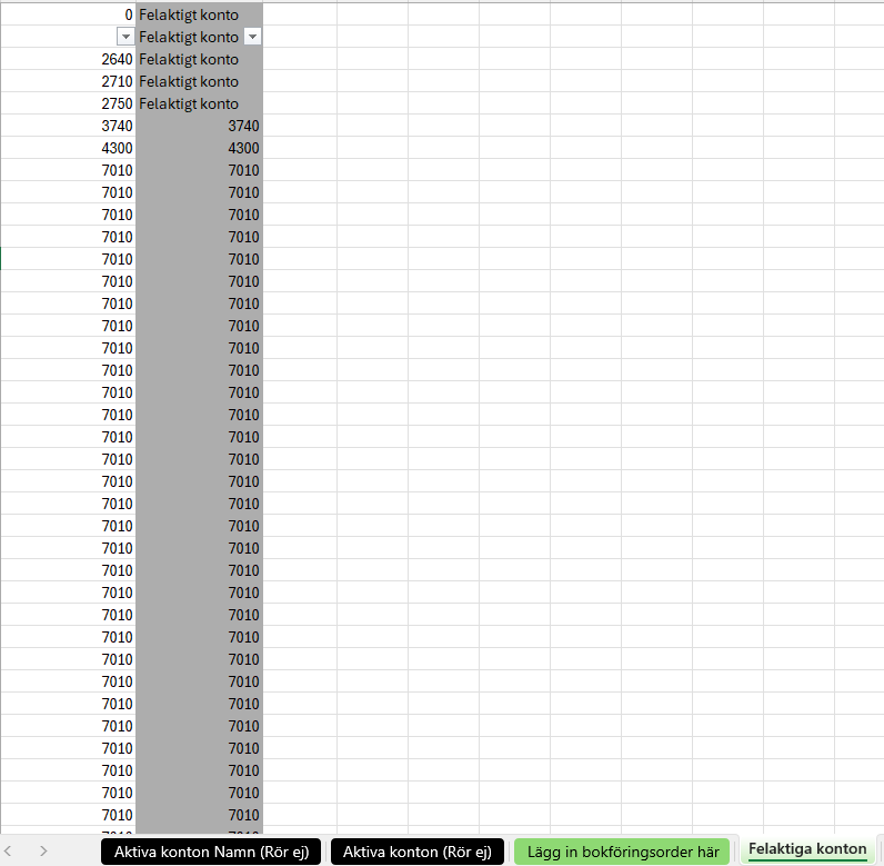 2. I fliken felaktiga konton visas om det används konton i filen som inte är giltiga. Den De översta 2 raderna kommer se fula ut och om 1 eller 2 konton saknar konto är ok.