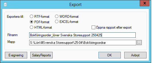 3. Spara pdfen under Lön/Bolag/Månad/Bokföringsordrar och lägg till "Bolag ÅÅMMDD" i namnet.