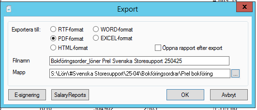 3. Spara pdfen under Lön/Bolag/Månad/Bokföringsordrar/Prelbokföring och lägg till "Prel Bolag ÅÅMMDD" i namnet.