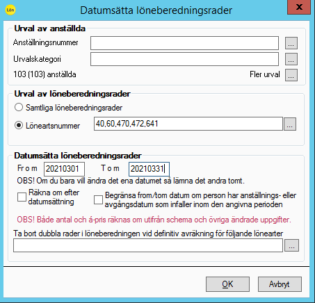 Fyll i de lönearter som du vill datumsätta samt from & tom-datum.