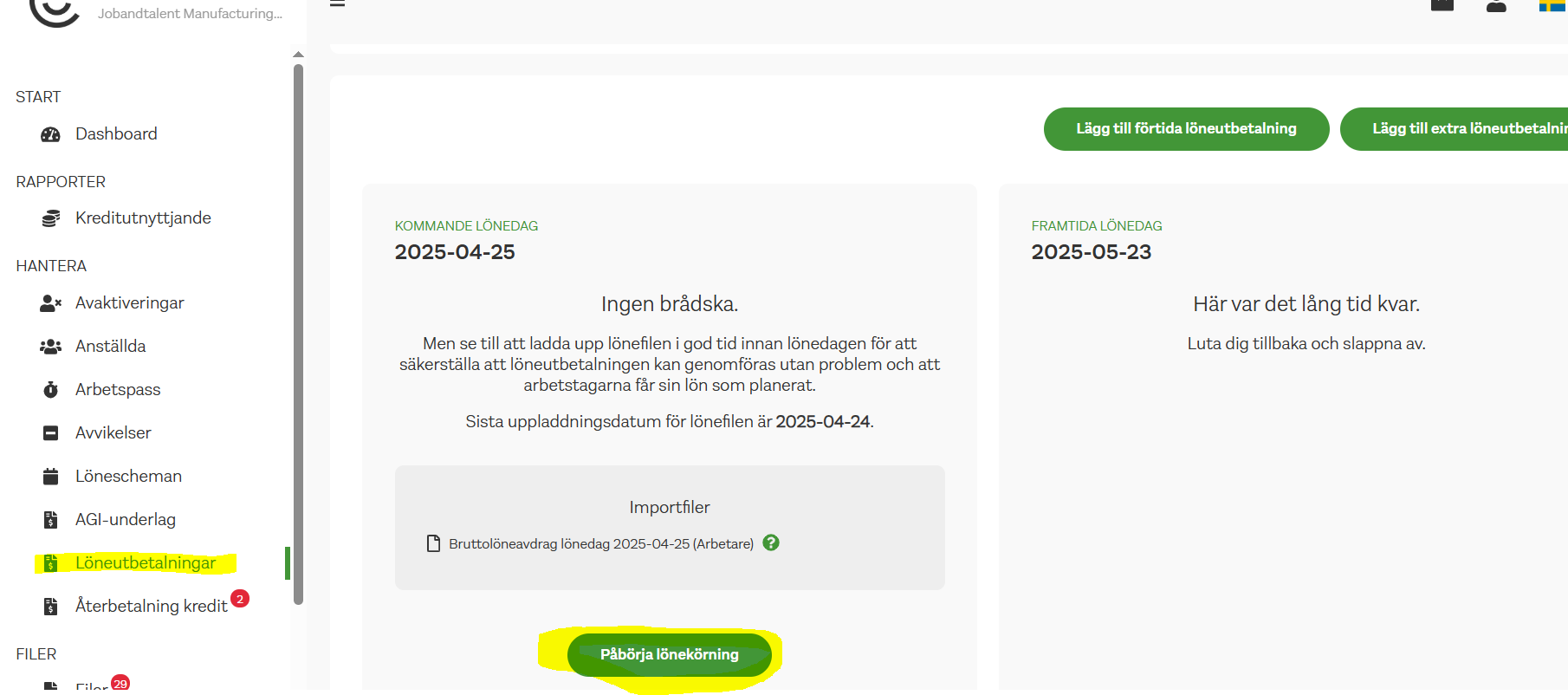 Gå till löneutbetalningar och tryck på "Påbörja lönekörning"