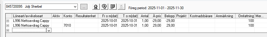 I lönekörningen i december behöver vi då göra avdrag för de som är med i denna rapport, L996 Nettoavdrag Cappy.