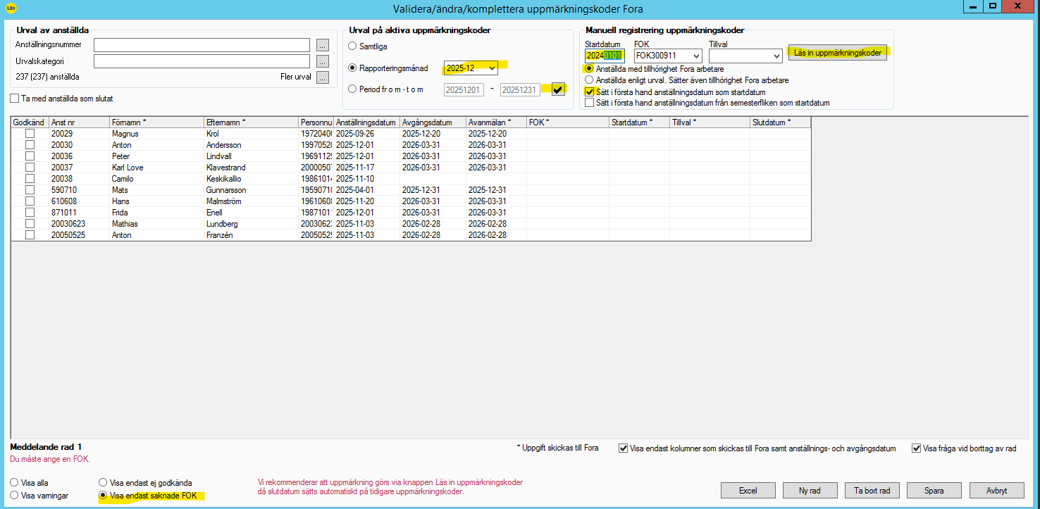 Välj aktuell månad, välj allt gult, sist trycker du Läs in uppmärkningskoder. Det är olika koder i alla bolag, men alla i samma bolag har samma FOK-kod. Det ska endast finnas en i varje rullista.