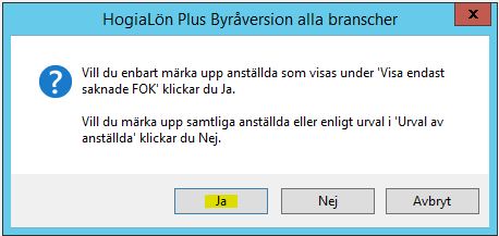 Väljer du Nej går du bort från bocken och märker då upp alla som saknar FOK-koder. Viktigt att INTE välja denna, då kan problemas uppstå.