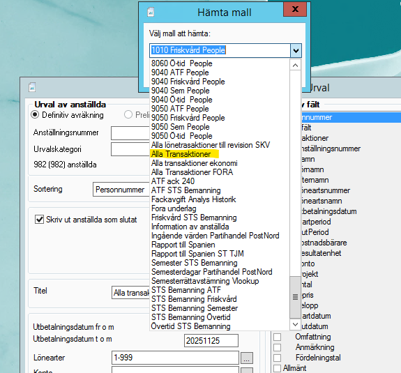 Rapporter --> Egna rapporter --> Person/Transaktion/Ackumulator --> Hämta mall --> Alla transaktioner