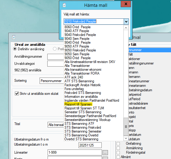 Rapporter --> Egna rapporter --> Person/Transaktion/Ackumulator --> Hämta mall --> Rapport till Spanien
