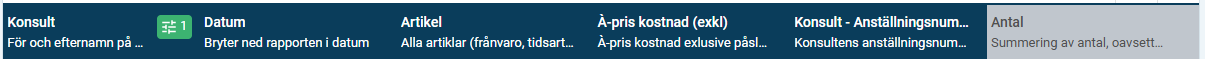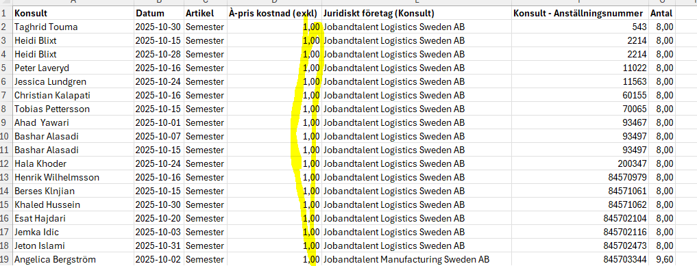 Förklaring av formel =SUMMA.OMF(Hela kolumnen för "À-pris kostnad (exkl)" ; Hela kolumnen där vi letar samband, ex anställningsnummer eller namn;' Namnet eller anställningsnumret i bladet formeln ligger i).