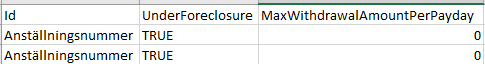 Under ID skrivs anställningsnummer, ta med alla anställningsnummer från samtliga KFM-listor. Skriv in "TRUE" och 0 enligt bilden ovan. Detta innebär att konsulten ska vara under uttagsbegränsning med 0kr i maxbelopp för uttag. Spara filen på samma plats som mallen och döp till dagens datum, radera filen efter uppladdning.