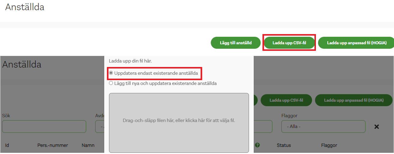 Välj sedan "Ladda upp CSV-fil" och "Uppdatera endast existerande anställda". Dra in eller hämta filen i den grå rutan och klicka sedan på ladda upp. Ladda upp samma fil i samtliga bolag, detta för att det kan ha skett bolagsbyten som kan ha missats i Cappy-portalen.