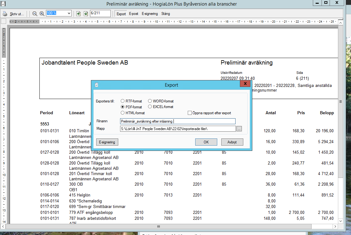 5. Spara pdf under S:\Lön\# Bolag \Månad\Bokföringsordrar\Prel bokföring och lägg till bolagsnamn och utbetalningsdatum.