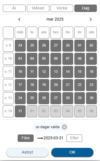 Kontrollera att det är rätt semesteravtal och att från och till-datum är rätt samt att bocken är med enligt bilden nedan.